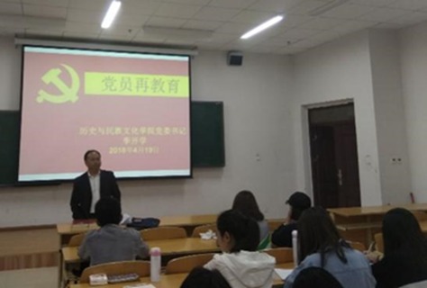 2018年4月19日晚18:30,历史与民族文化学院党委党员再教育系列活动拉开序幕。历史与民族文化学院全体学生党员参加了该活动。党员再教育活动开篇由学院党委书记李开学以“理想信念再教育”为题为全体学生党员讲授党课。