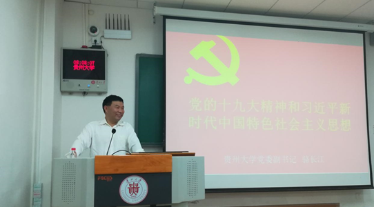 骆长江副书记先给同学们回忆了习近平总书记在2011年5月9日来到我们贵州大学时的场景,当时作为联络员的他,把每一个细节都深深印在了脑海里。接着,骆书记说,十九大报告是有史以来内容最丰富,篇幅最长的大会报告,习总书记花了3个半小时才报告完,在史上也是绝无仅有,所以十九大报告的地位不言而喻。接下来,骆书记从十九大报告的主题、习近平新时代中国特色社会主义思想的历史地位、“八个明确”、“十四个坚持”等方面向我们详细深刻地传达了十九大精神。骆书记说,我们现在正处在全面建成小康社会的决胜阶段,也是中国特色社会主义进入新时代的关键时期,但现在尚有几千万群众还未脱贫,要完成这个目标还需我们不断努力。我们现在还要高举中国特色社会主义的伟大旗帜,不忘初心,牢记使命,为人民谋幸福,为民族谋复兴。